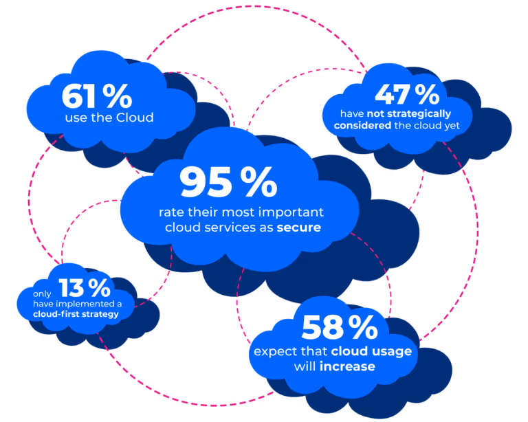 In the PwC study from 2022, 61% of insurance companies stated that they were already relying on the cloud, but only 13% of the insurance companies surveyed already had a cloud-first strategy. Despite the supposed data protection risks that are repeatedly discussed in the context of cloud applications, a full 95% of insurance companies rate their cloud services as secure. Every second insurer (47%) sees uncertainty regarding regulatory requirements as a potential risk with cloud services and around half (45%) also see compliance violations as a challenge.