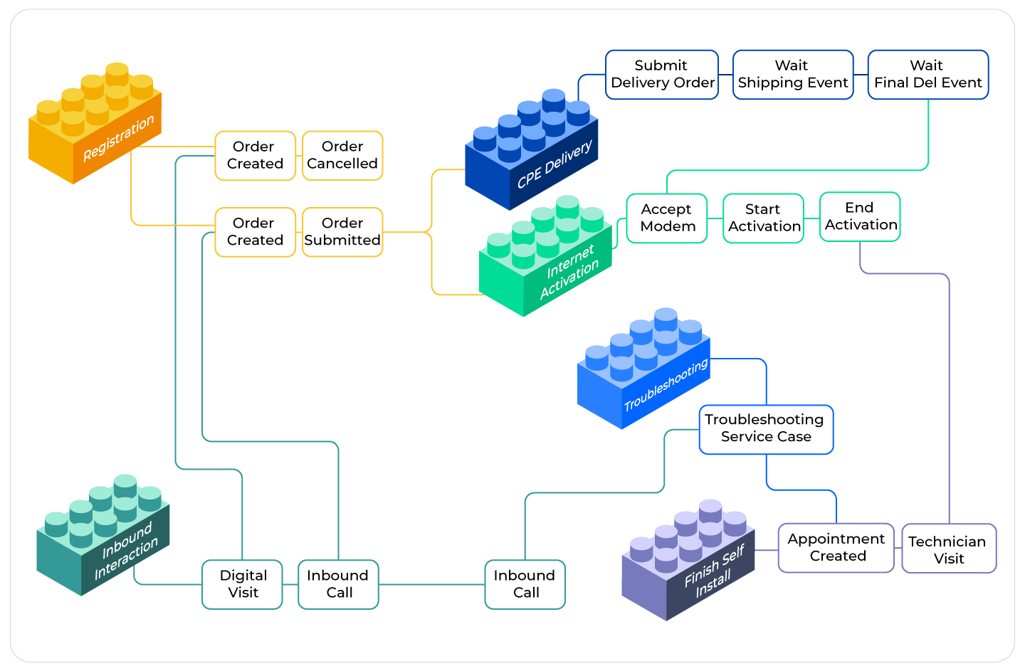 On top, the Telenet team decided to go for a modular approach and structured the processes like “lego bricks”: one subprocess with clear results and no optional steps.