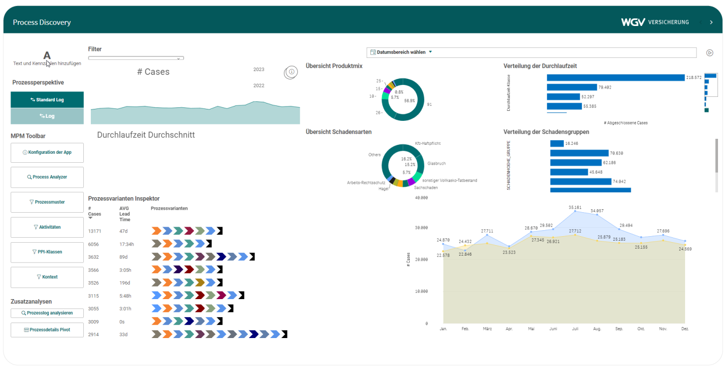 A decisive factor in the choice of mpmX was the simple data integration, which was used, for example, to supplement data for analyzing the customer relationship. Thanks to the partnership-based and trusting support of the mpmX experts, it was possible to establish a flexible Process Mining platform that can answer WGV‘s specific strategic questions.